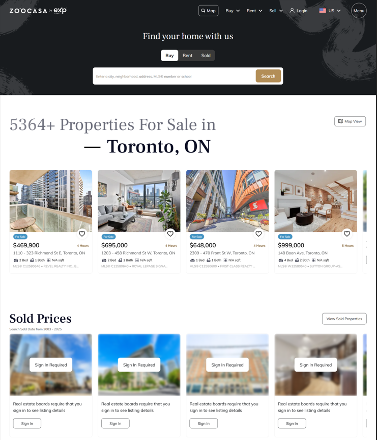 Zoocasa uses a polished, modern layout with strong market insights, curated listings, and agent-matching tools. Their emphasis on accuracy, local data, and clean filtering makes the landing experience both helpful and conversion-friendly.