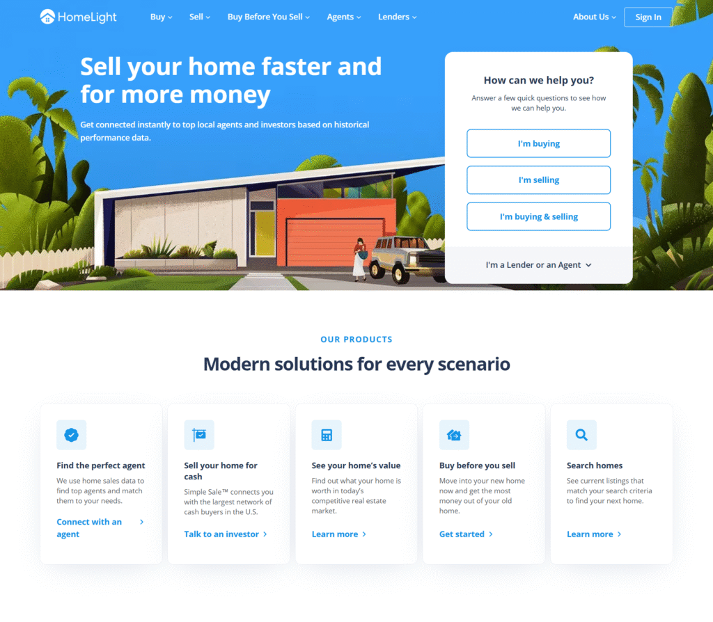 HomeLight’s pages shine through data-driven trust elements, showcasing agent performance stats, success percentages, and transparent comparisons. The simple layout and credibility-forward approach help users make confident choices quickly.